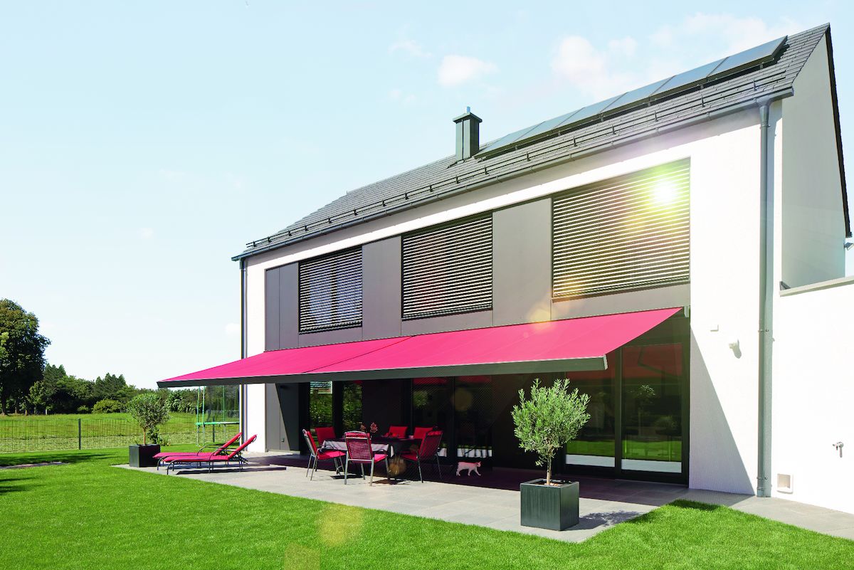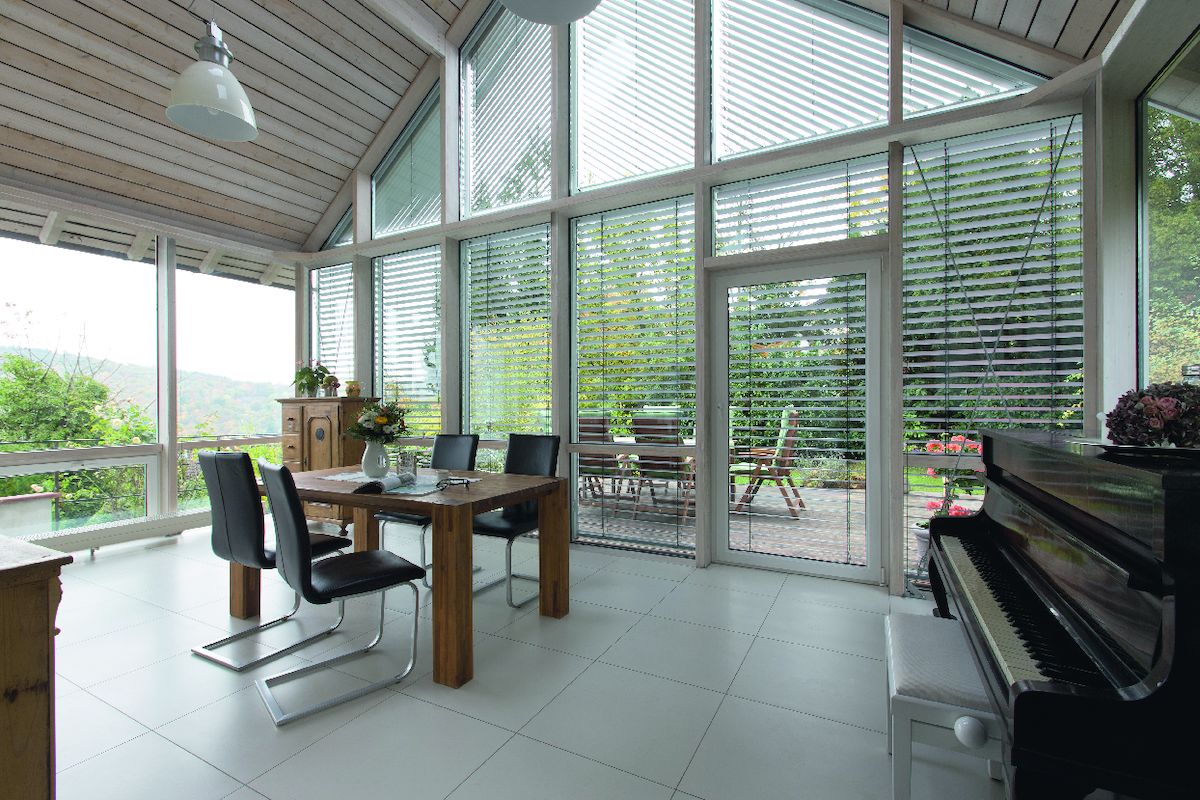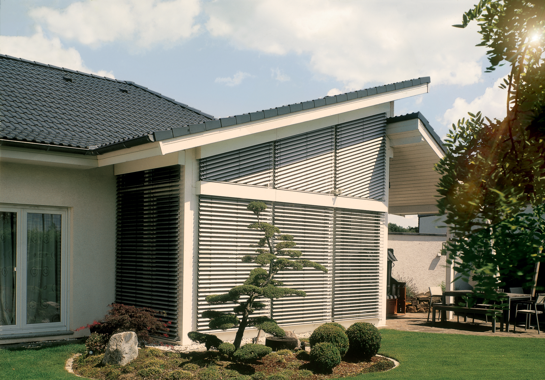 Außenjalousien und Raffstoren sind, genau wie Rollläden und Markisen, als Sonnenschutz besonders zu empfehlen, denn sie absorbieren einen großen Anteil der Sonneneinstrahlung und verhindern so ihr Eindringen in den Wohnraum. Dank ihrer verstellbaren Lamellen kann der Lichteinfall nach Bedarf reguliert werden. Als Außenjalousie bezeichnet werden Ausführungen mit bis zu 50 mm breiten Lamellen, Raffstorelamellen sind hingegen im Vergleich breiter und profilierter.