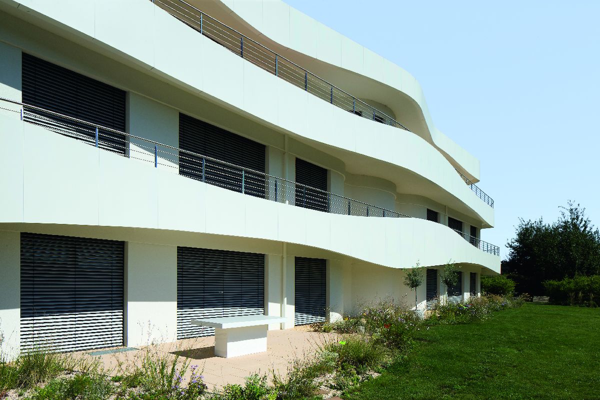 Schrägraffstoren verdunkeln auch asymmetrische Fensterformen. Optisch werden sie dabei perfekt auf alle anderen Außenjalousietypen angepasst und integrieren sich perfekt in das Fassadenbild.